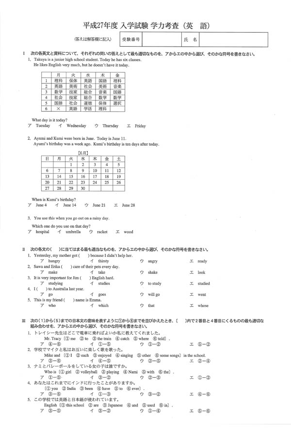 平成27年度入試過去問題 全日制推薦入試: 数学(問題) 英語(問題)