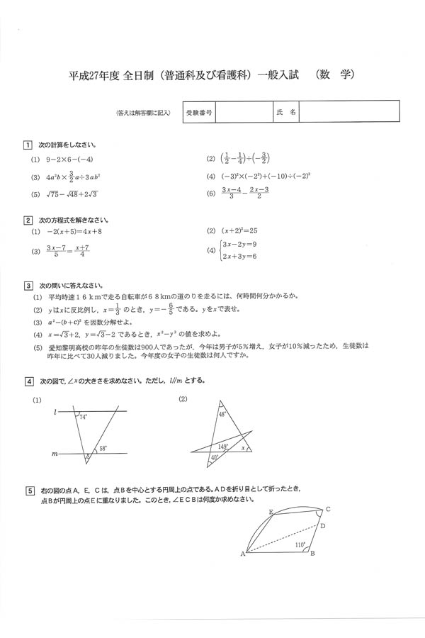 ■平成27年度入試過去問題 全日制一般入試(数学 問題)