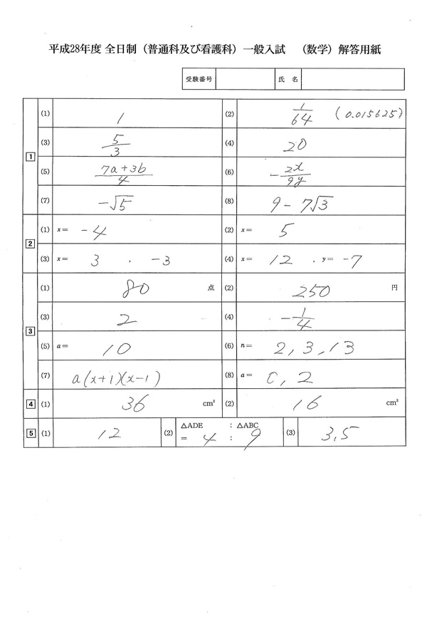 ■平成28年度入試過去問題 全日制一般入試(数学 解答)