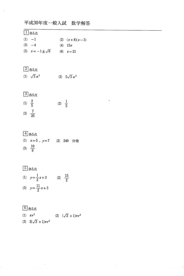 ■平成30年度入試過去問題(数学 解答)