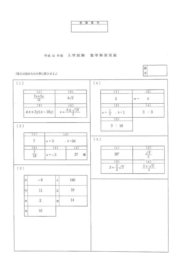 ■平成31年度入試過去問題(数学 解答)