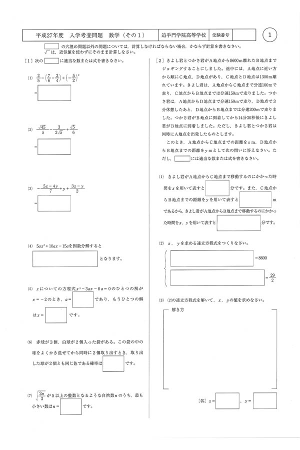 平成27年度入試過去問題: 数学(問題) 英語(問題) 理科(問題)