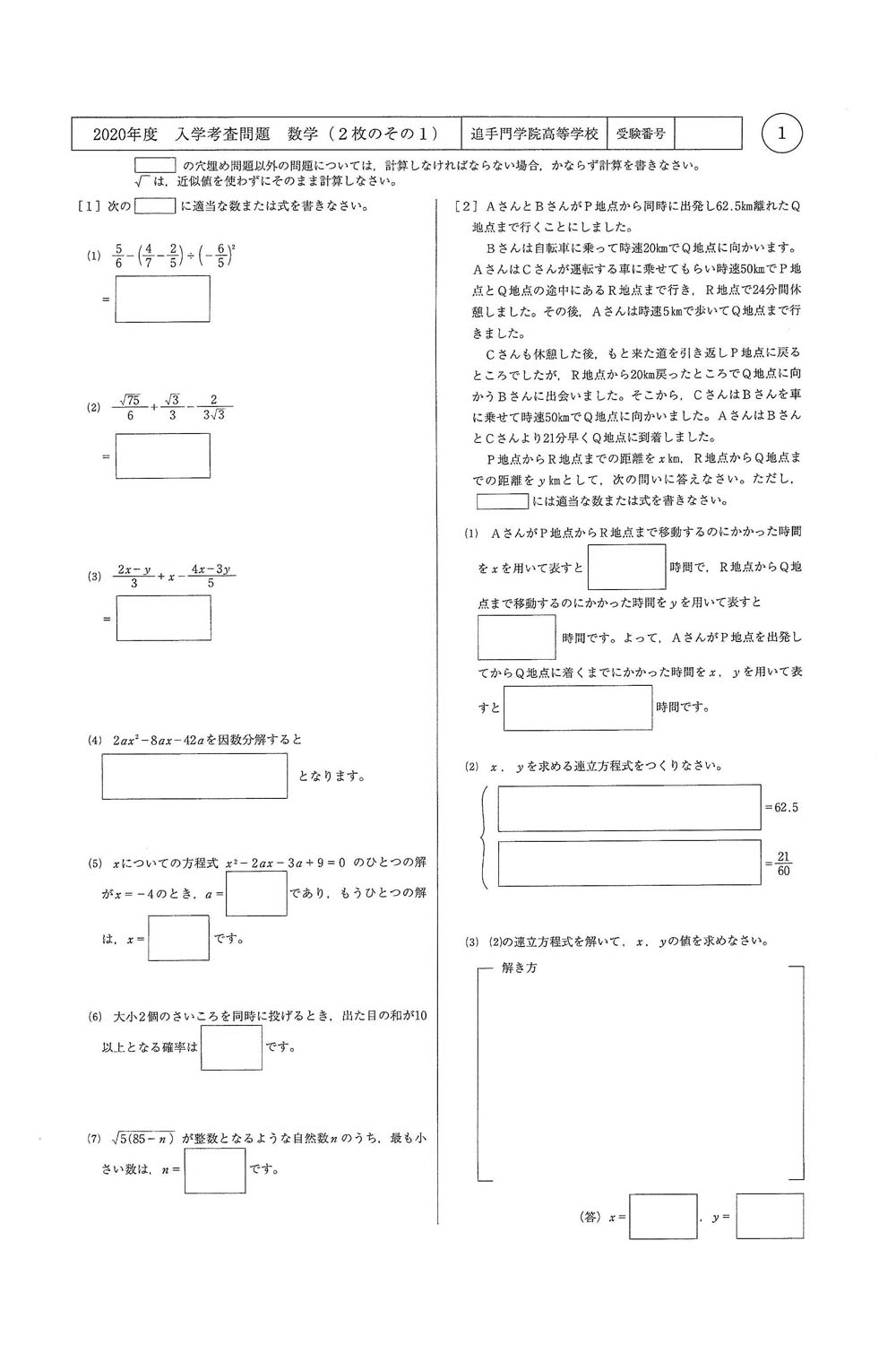 2020年度入試過去問題: 数学(問題) 英語(問題) 理科(問題)