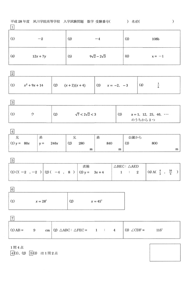 ■平成28年度入試過去問題(数学 解答)