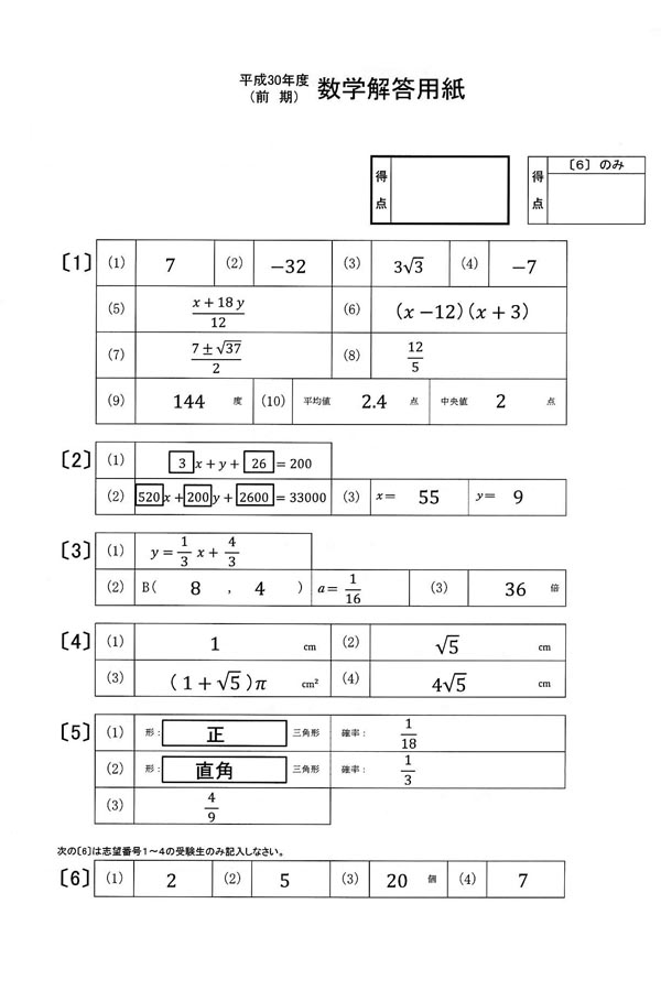 ■平成30年度入試過去問題(数学 解答)