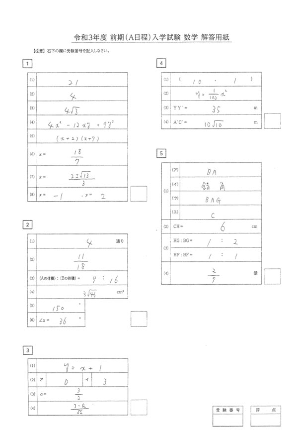 ■2021年度入試過去問題  前期(A日程)(数学 解答)