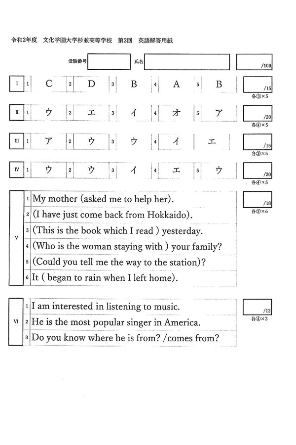 ■2020年度入試過去問題 第2回(英語 解答)