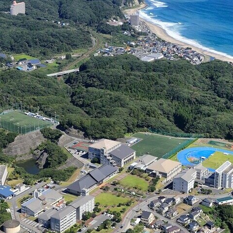 キャンパスは、房総半島の東南、勝浦市内の太平洋を見下ろす高台に位置しています。体育系大学として国内最高水準の教育環境を実現する多様な施設・設備が機能的にレイアウトされています。夜間照明設備を備え、地域小中学校の陸上競技会にも利用される全天候型陸上競技場などを完備。雄大で開放的な空間が4年間のキャンパスライフを送る舞台です。