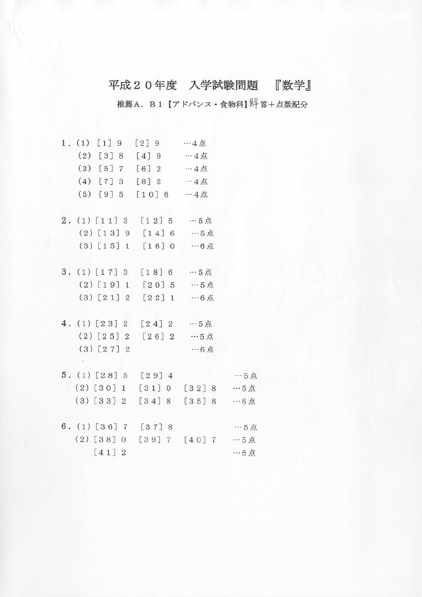 ■平成20年度入試過去問題 推薦A・B1 アドバンス食物(数学 解答)