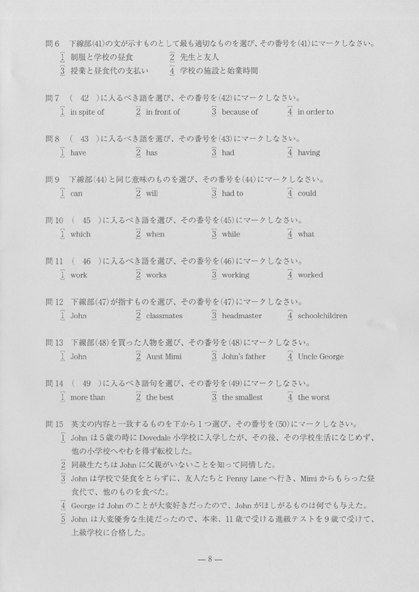 ■平成20年度入試過去問題 推薦A・B1 アドバンス食物(英語 問題)
