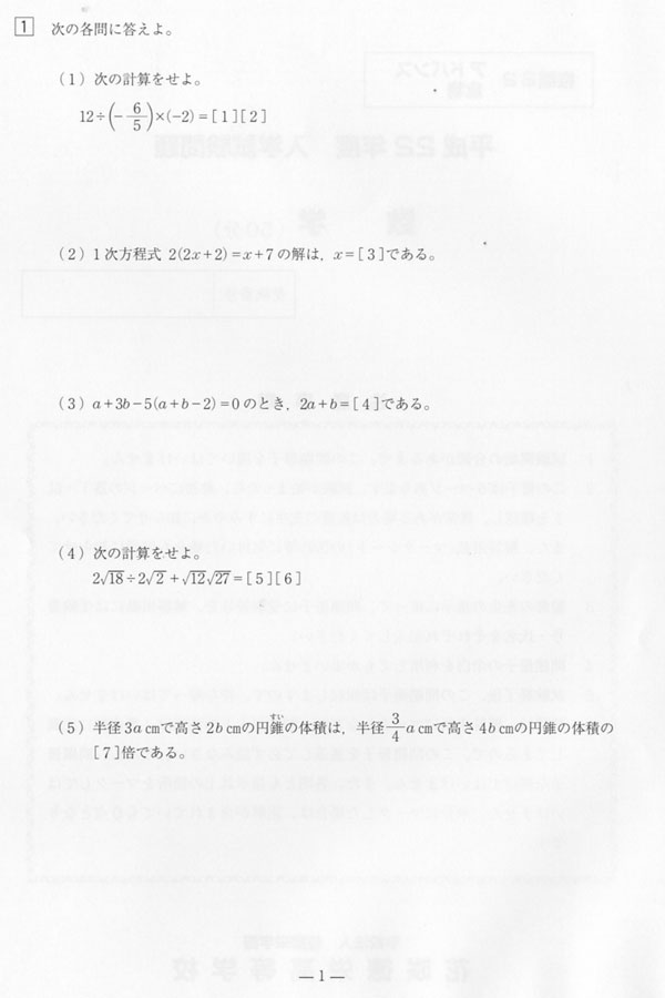 平成22年度入試過去問題 推薦B2 アドバンス/食物: 数学(問題) 英語(問題)