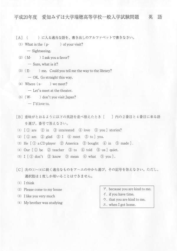 平成20年度入試過去問題: 数学(問題) 英語(問題)
