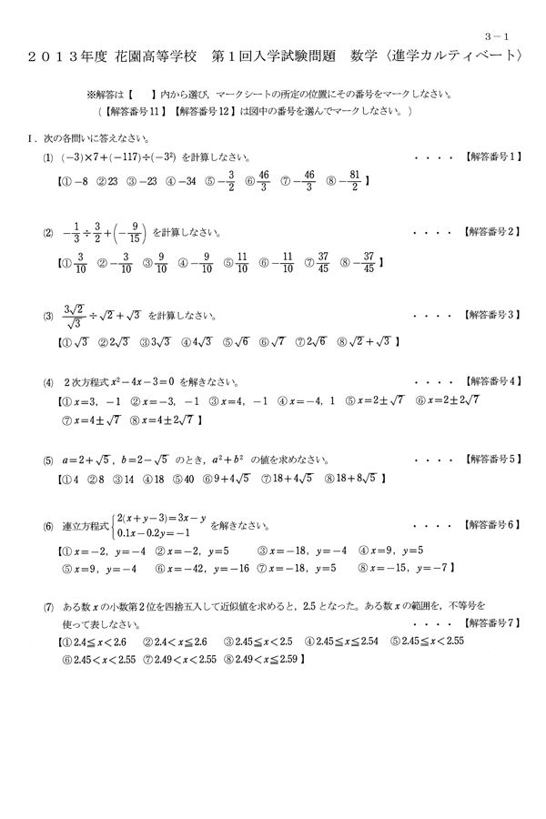 ■平成25年度入試過去問題 進学カルティベート(数学 問題)