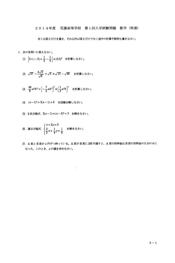■平成26年度入試過去問題 特進第1回(数学 問題)