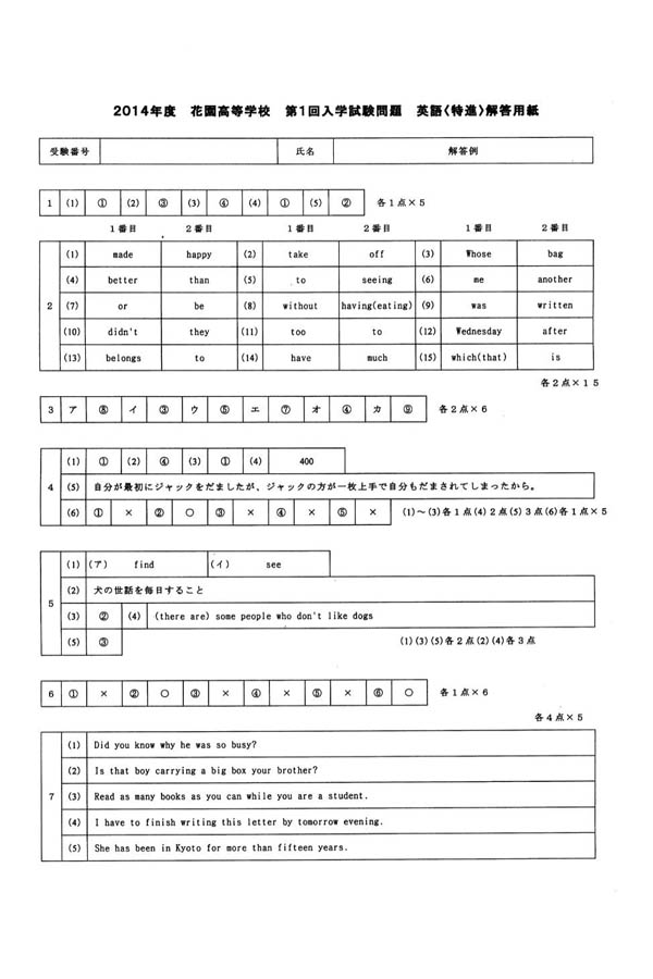 ■平成26年度入試過去問題 特進第1回(英語 解答)