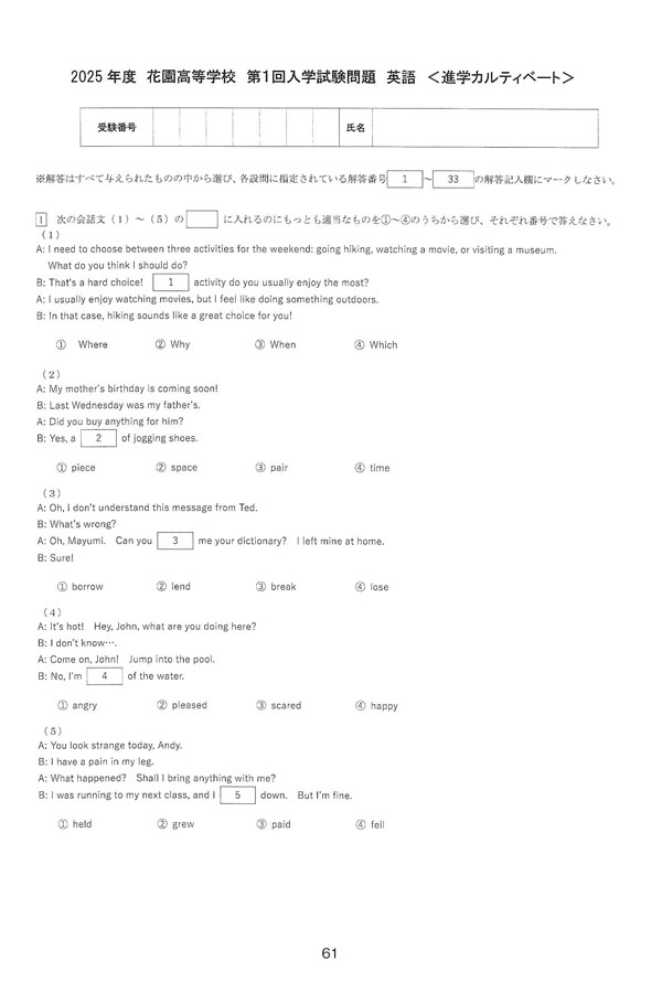 花園高等学校の入試過去問題[問題編]、資料(パンフレット)請求、入試(受験)、説明会などを掲載