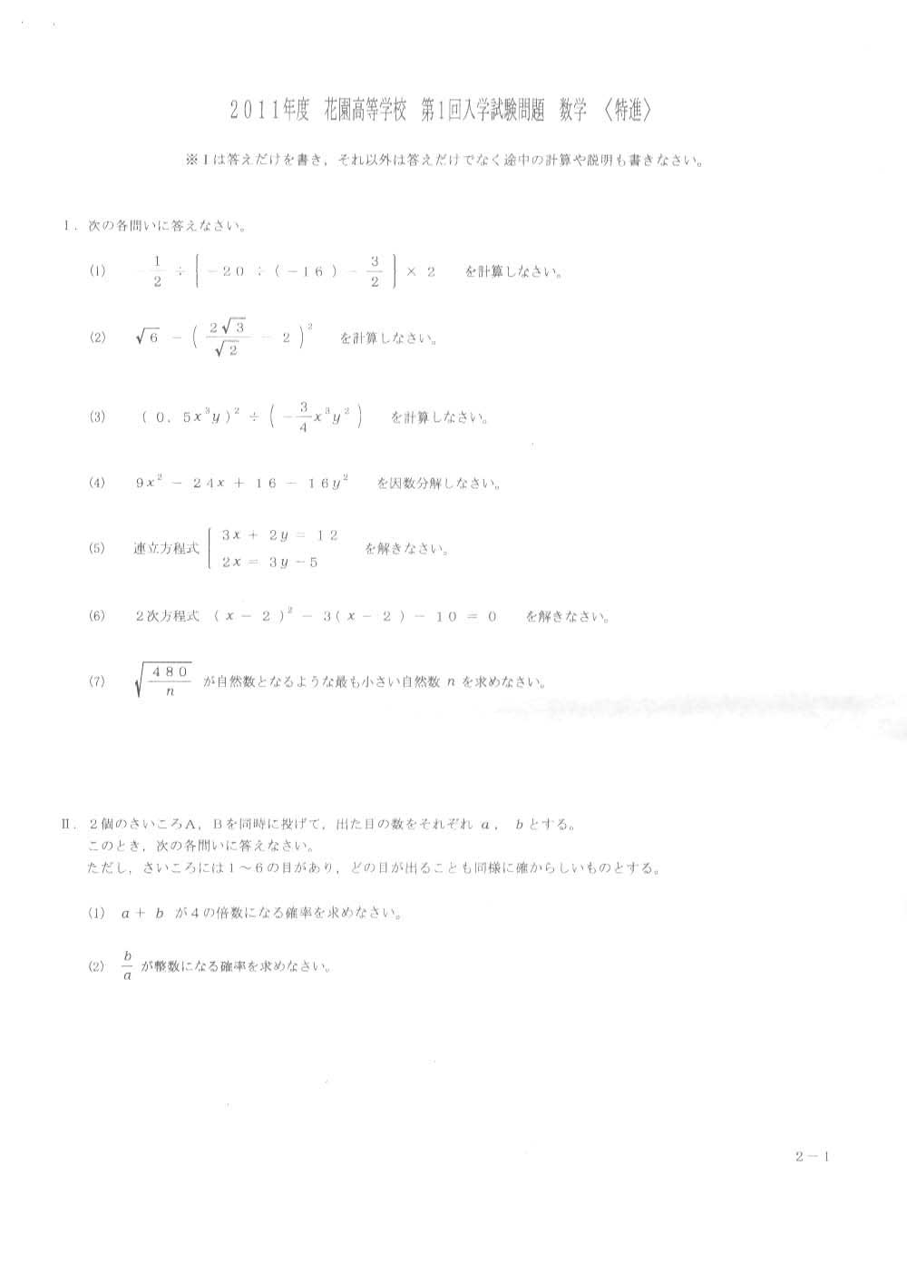 平成23年度入試過去問題 特進: 数学(問題) 理科(問題) 英語(問題)