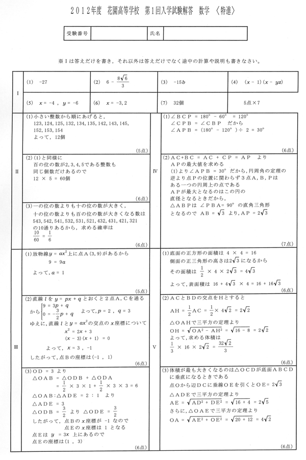 平成24年度入試過去問題 特進: 数学(問題) 英語(問題) 理科(問題)