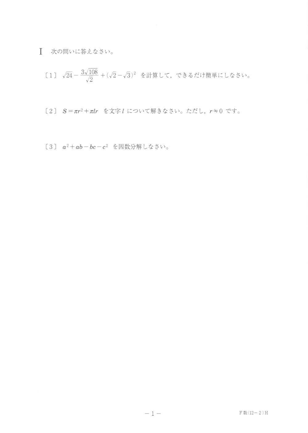 平成23年度入試過去問題 前期: 数学(問題)