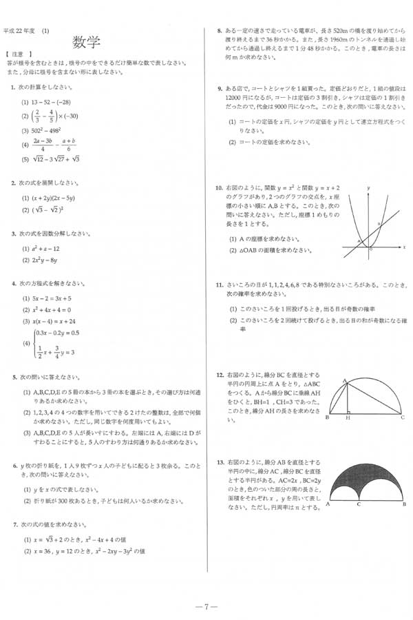 ■平成22年度入試過去問題(数学 問題)