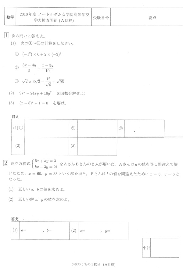 ■平成22年度入試過去問題 (A日程)(数学 問題)