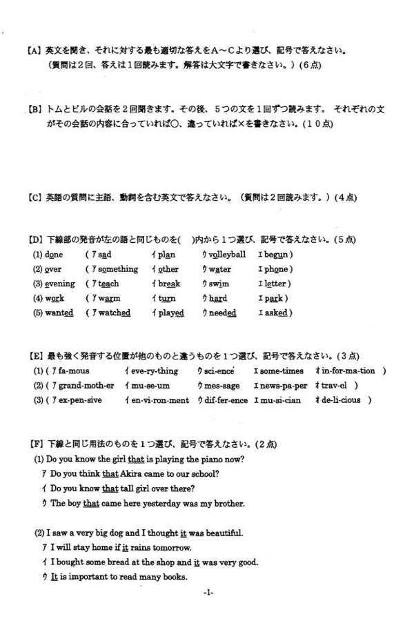 平成26年度入試過去問題: 数学(問題) 英語(問題)