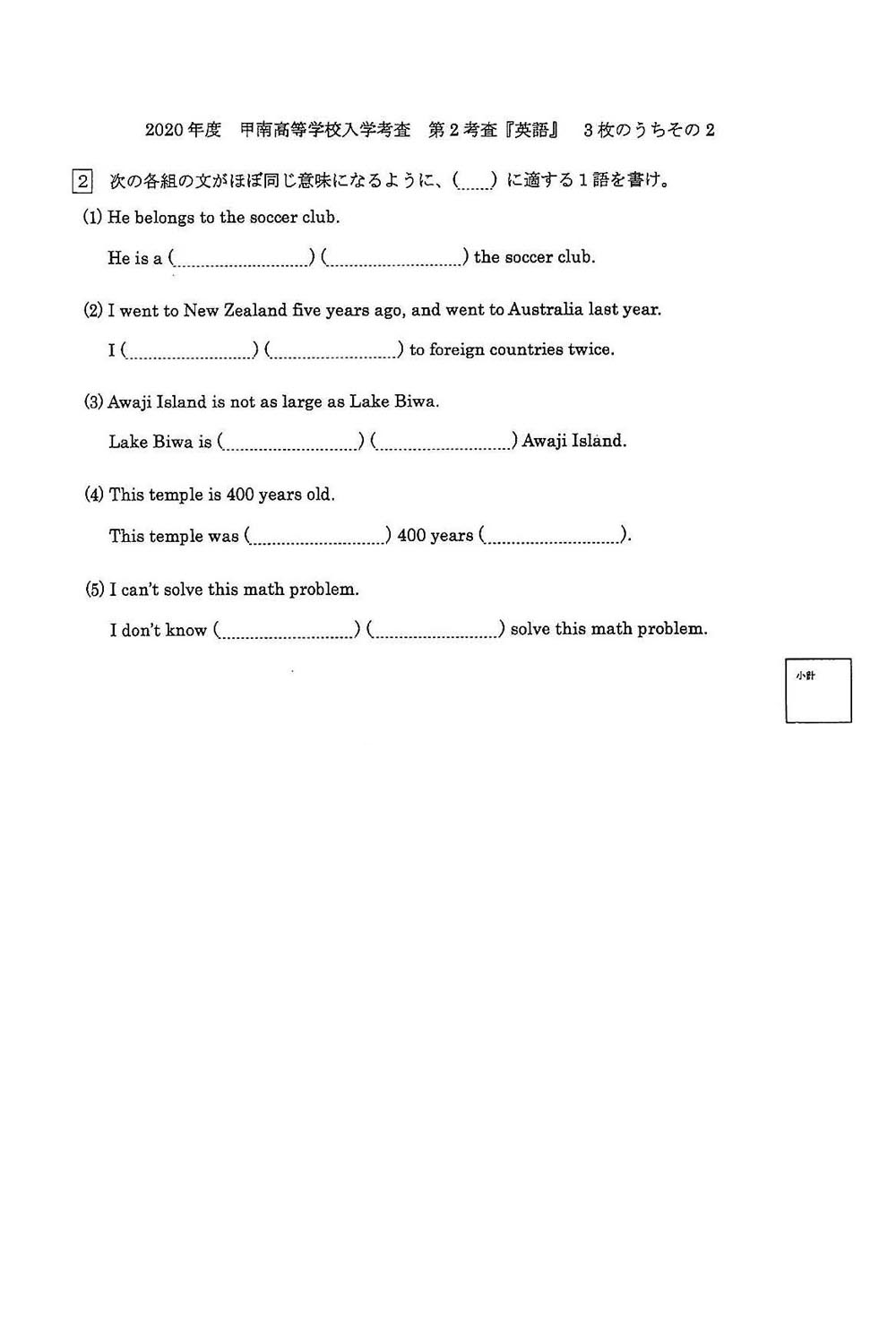2020年度入試過去問題: 数学(問題) 英語(問題)