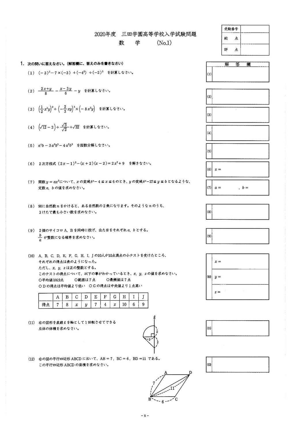■2020年度入試過去問題(数学 問題)