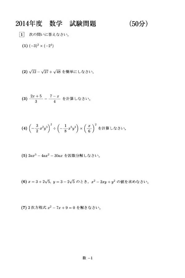 平成26年度入試過去問題: 数学(問題) 英語(問題)