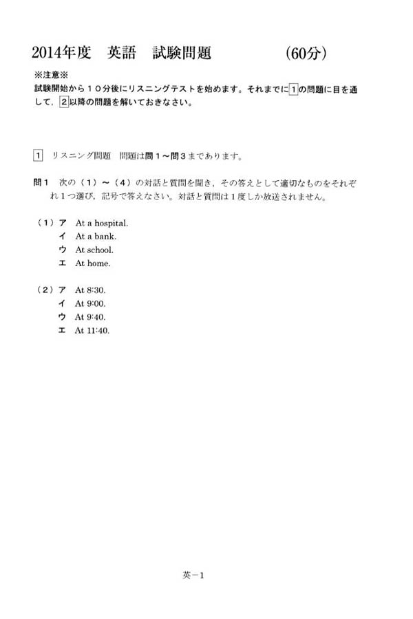 平成26年度入試過去問題: 数学(問題) 英語(問題)