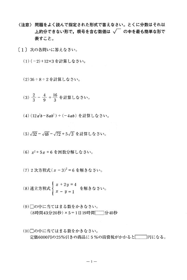 平成24年度入試過去問題 第1次: 数学(問題) 英語(問題)
