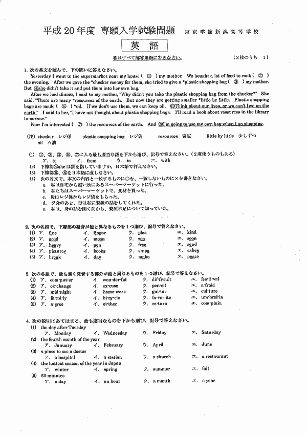 平成20年度入試過去問題 専願入試: 数学(問題) 英語(問題)