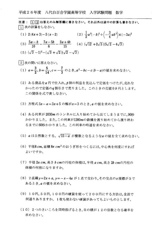 平成26年度入試過去問題 特別進学・進学コース: 数学(問題) 英語(問題)