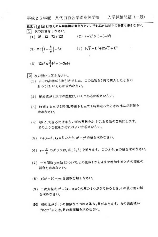 平成26年度入試過去問題 一般: 数学(問題) 英語(問題)