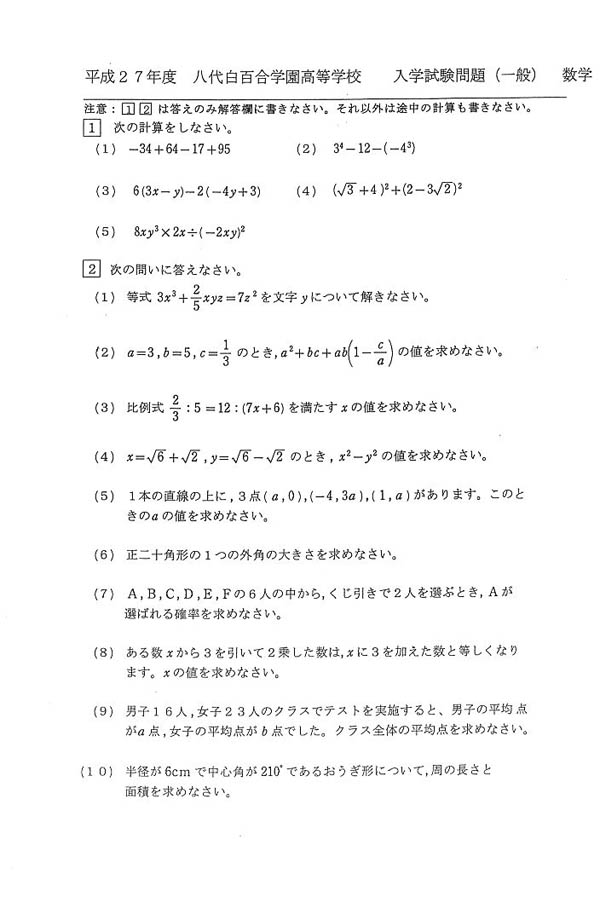 ■平成27年度入試過去問題 一般(数学 問題)
