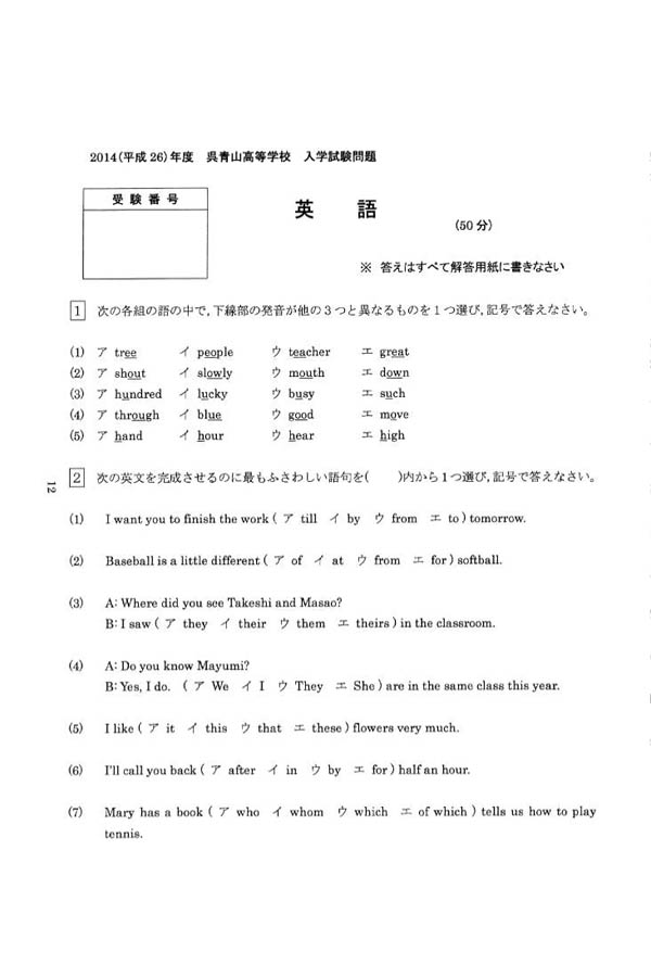 平成26年度入試過去問題: 数学(問題) 英語(問題)